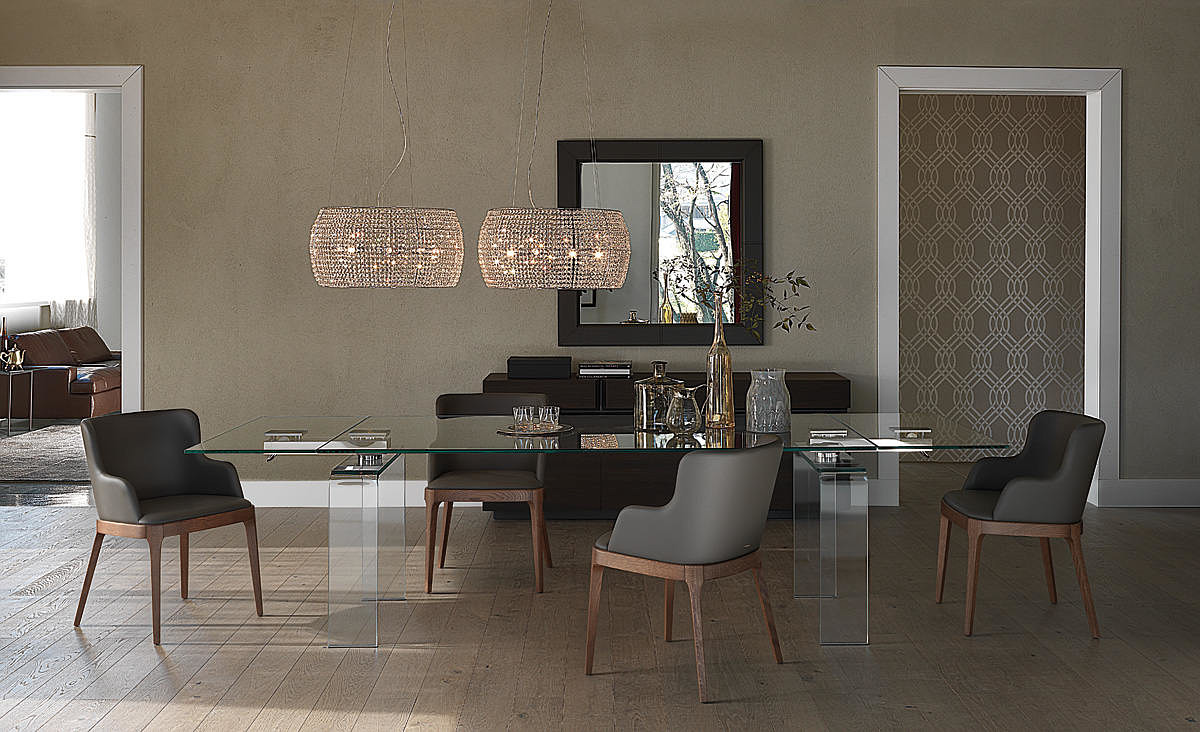 Раздвижной стол с ножками из прозрачного или сверхпрозрачного изогнутого стекла. Столешница и раздвижные части из прозрачного стекла или сверхпрозрачного закаленного стекла 15 мм (раздвижные части 12 мм). Механизм из глянцевой нержавеющей стали и алюминия.